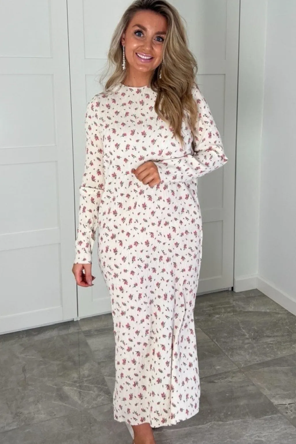 Lysegul kjole fra Neo Noir med pink og grønne blomster. Den har lange ærmer, rund hals og høje slidser i siderne. Kjolen er ankellang med en tætsiddende pasform.