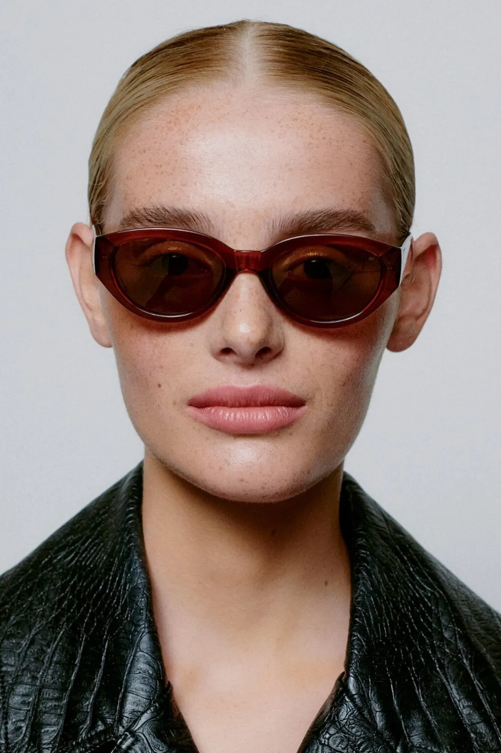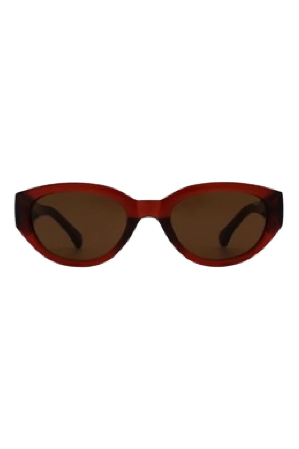 Brune solbriller fra A. Kjærbede med katteøjeform. Brillerne er lavet af polycarbonat med en blank overflade og har formbare stænger med metalkerner.