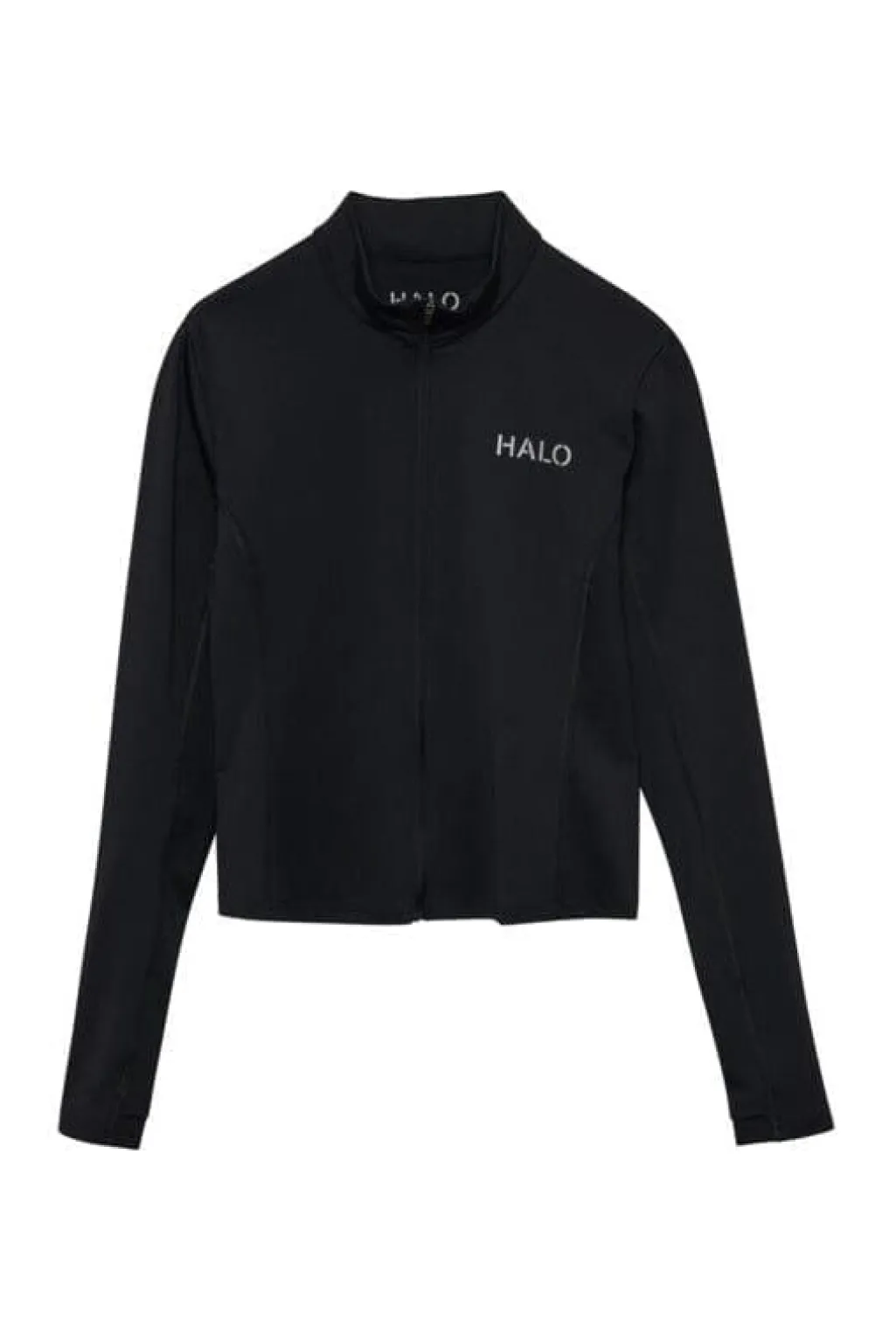Sort trøje med lynlås fra HALO, fremstillet i fleksibelt polyamid med elastan. Trøjen har refleksprint med HALO-logoet foran og ATW-logoet bagpå.
