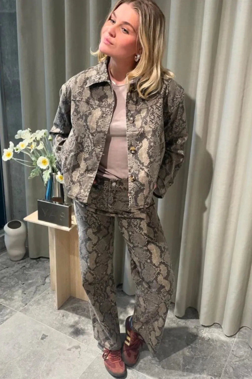 Denimjeans fra Y. A.S med slangeskindsprint i brune og beige nuancer på sort baggrund. Den høje talje og regular fit giver en klassisk pasform.
