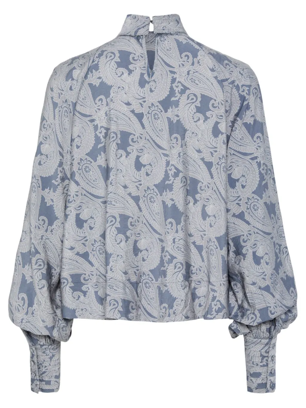 Langærmet bluse fra Y. A.S i lyseblå med gråt paisley-mønster. Blusen har høj hals med sløjfe og pufærmer med smock-manchetter. Den lukkes med knapper i ryggen.
