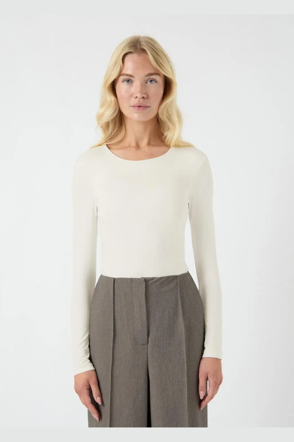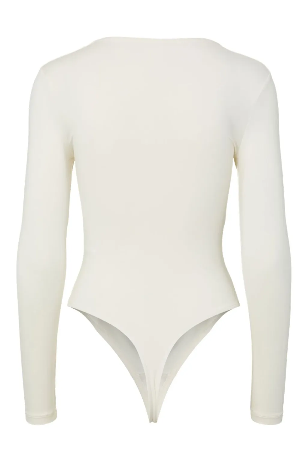 Hvid body fra Y. A.S med lange ærmer og høj hals. Den tætsiddende model er lavet af strækbart jerseymateriale, der giver en god pasform til både hverdag og fest.
