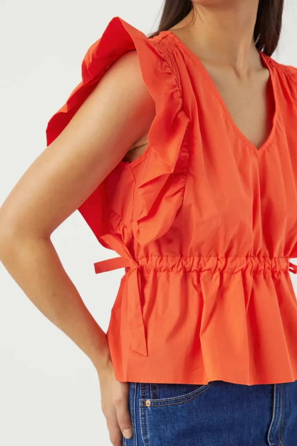 Rød top fra Y. A.S med V-halsudskæring og flæsebesatte ærmer. Toppen har en samlet talje og en regular pasform, der giver god bevægelsesfrihed.