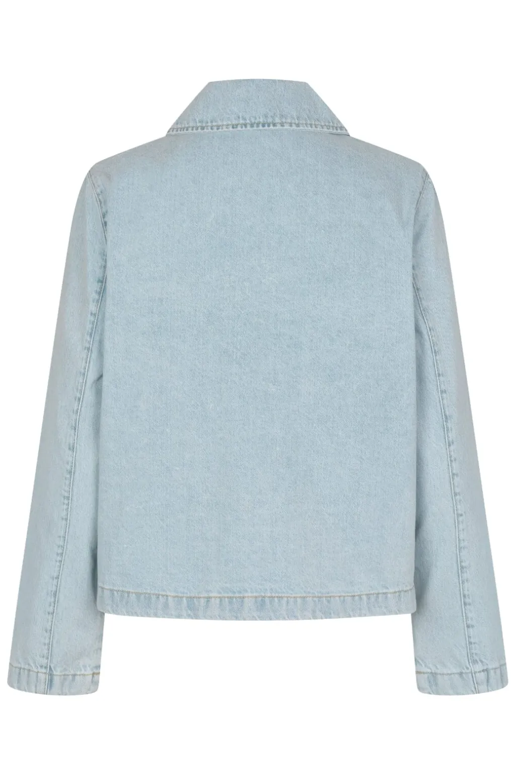Denimjakke fra MbyM i en lys blå vask. Den har skjortekrave og knaplukning foran. To store frontlommer giver jakken et praktisk og casual udtryk.