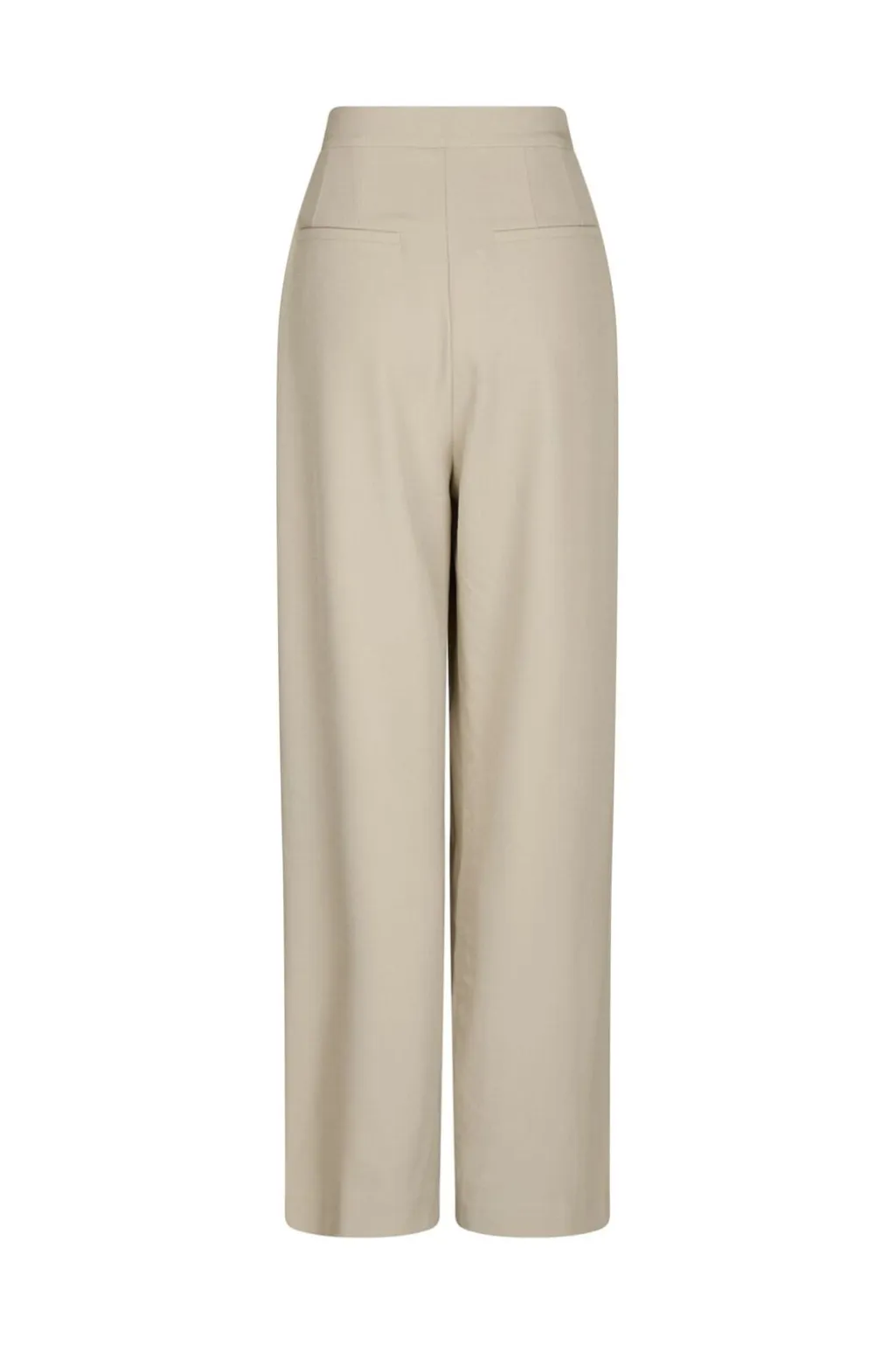 Sandfarvede bukser fra Neo Noir med høj talje og dobbelte læg foran. Bukserne har en øjelet-detalje ved linningen og vide ben med en løs pasform.