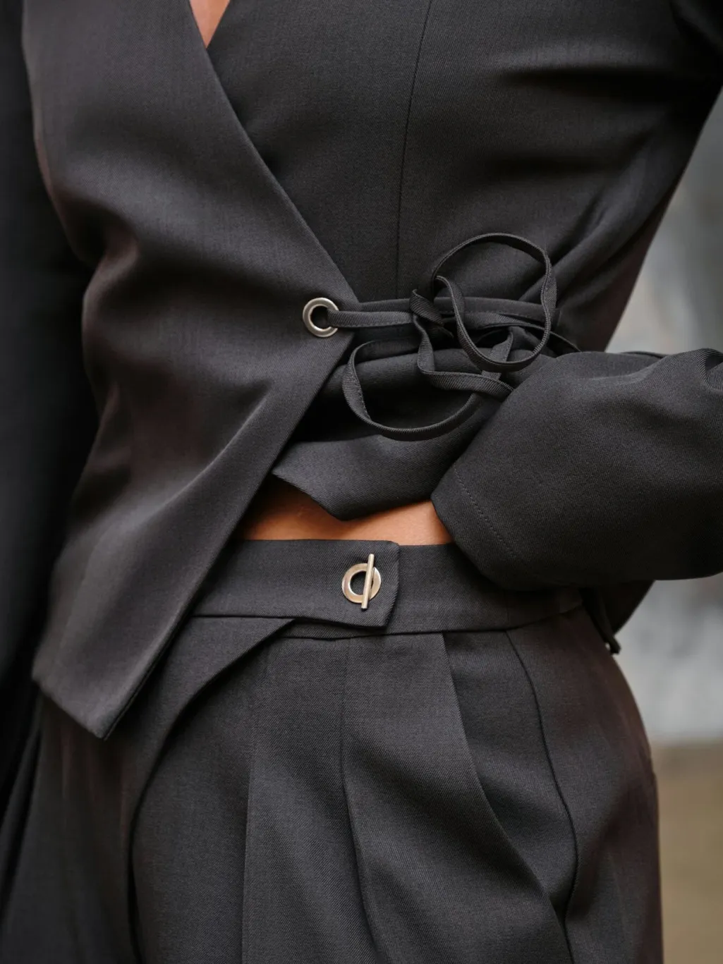 Mørkegrå bukser fra Neo Noir med høj talje og dobbelte læg foran. Bukserne har en løs pasform og går ned til gulvet. De har paspel-lommer bagpå og en praktisk lukning med skjult lynlås.