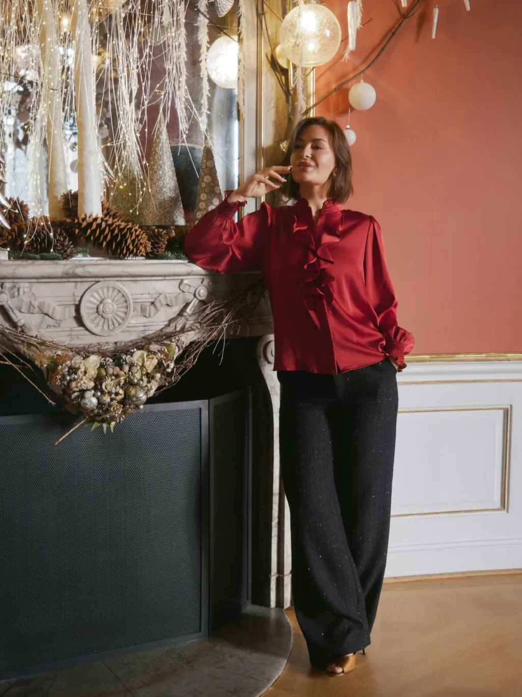 Mørkerød bluse fra Neo Noir i blød satin kvalitet. Blusen har en høj krave med flæsedetaljer og lange ærmer med elastiske manchetter.