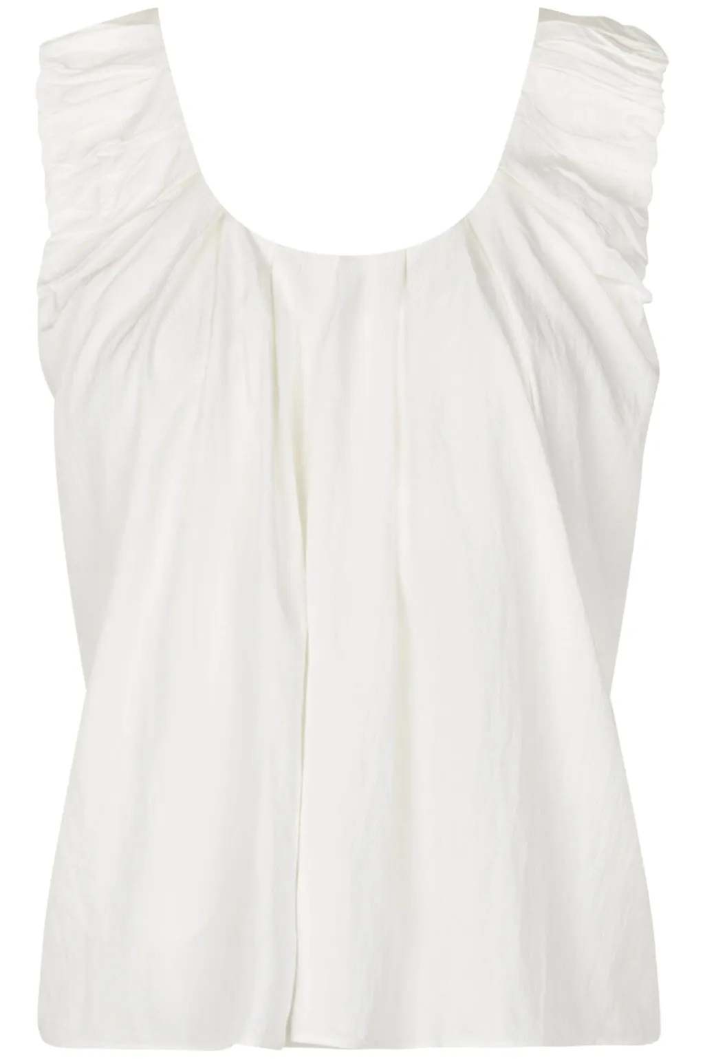 Hvid top fra MbyM med rynkede detaljer ved skuldrene og åben ryg. Toppen har en rund halsudskæring og en let struktur i stoffet.