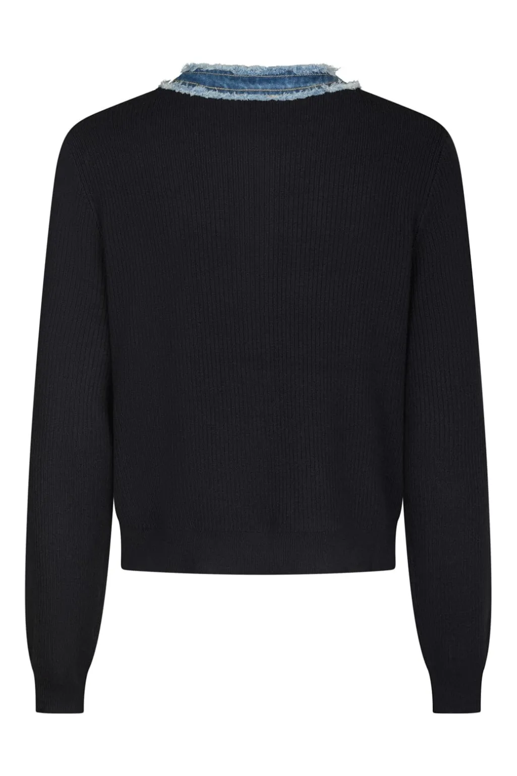 Mørkeblå strikket cardigan fra Neo Noir med denimkanter ved kraven og lommerne. Cardiganen har knapper foran og flæsedetaljer, der giver et blødt præg.